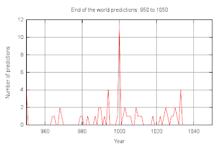 It looks like a fair number of the predictions put the end of the world on a 500 year boundaries. In particular there are spikes at year 1000 and year 2000. Below are close up graphs for those periods: